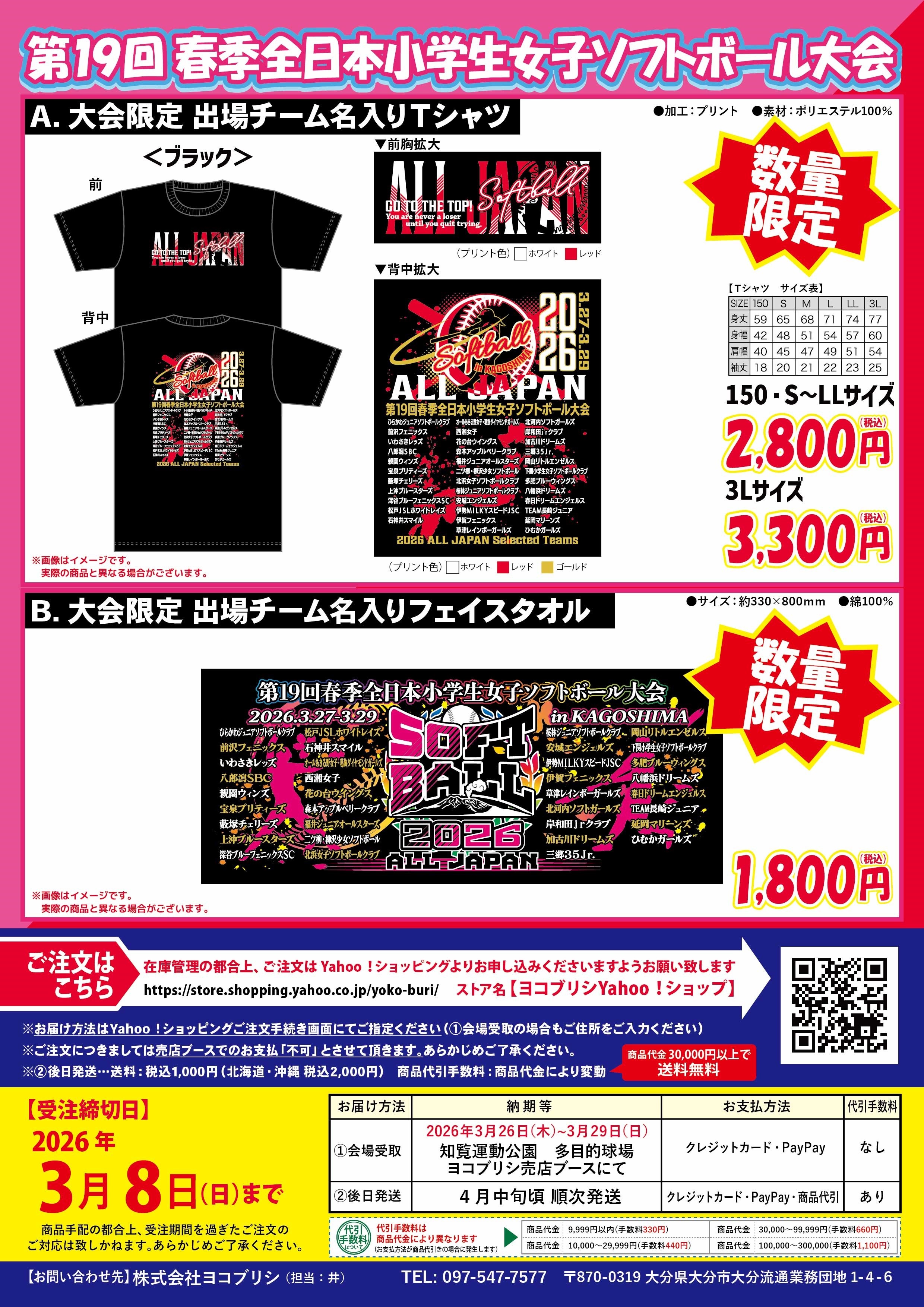 | ☆第19回 春季全日本小学生女子ソフトボール大会 ・ 主催 公益財団法人 日本ソフトボール協会 主管 (一社)鹿児島県ソフトボール協会、南薩支部ソフトボール協会 協賛 名鉄観光サービス株式会社、株式会社フォトクリエイト 会期 令和8年3月27日(金)~3月29日(日) 予備日:3月30日(月) 会場 鹿児島県南九州市 知覧平和公園 多目的球場他 ※※※☆日程変更・ 2☆実施要項・・・3☆申込書 4☆宿泊 弁当など案内と申込・・・5☆特産品 弁当など案内と申込・・・ 6☆サミージャパン株式会社案内1・・☆ 案内・注文書 ・・7☆サミージャパン株式会社申込2・・・8☆リトルリーグソフトボールワールドシリーズおよび アジア太平洋地区予選へのチーム派遣について ・ 9☆リトルリーグ・ソフトボール部門Q&A ・ 10☆第19回春季小学生女子大会の記念品カタログ案内 株式会社 コントリビュート ・ ・ 11☆第19回春季全日本小学生女子ソフトボール大会 大会前注文書【株式会社ヨコブリシ】